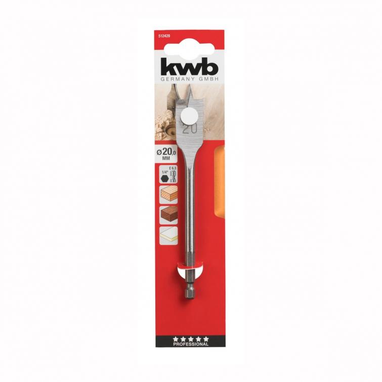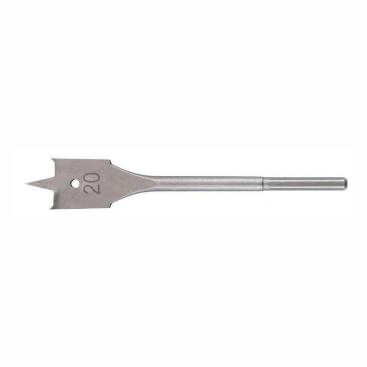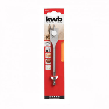 Vlakfreesboren, houtbewerking, 1/4"-zeskantschacht volgens ISO 1173, E 6.3, met centreerpunt en 2 voorsnijders, speciale snijkantvorm, precisiegeslepen, om veilig en precies te boren, kleur grijs, gezandstraald, nauwkeurig boren met weinig krachtinspanning, voor zacht- en hardhout en lichte bouwmaterialen.