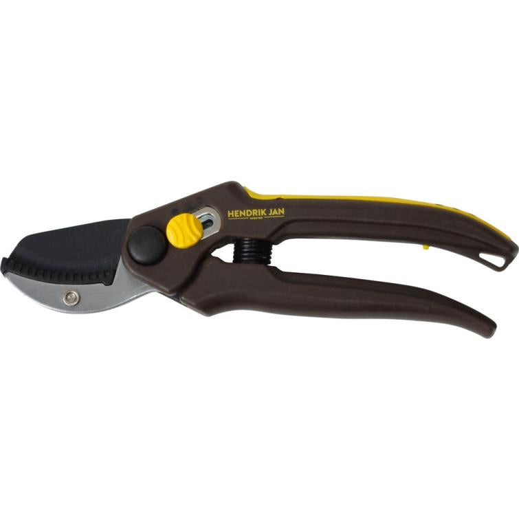 Hendrik Jan snoeischaar uitgevoerd met aambeeld dat de tak tegenhoudt terwijl het bovenliggende, bewegende mes door de tak heen snijdt en op het aambeeld aansluit. Voor het snoeien van oudere takken en twijgen tot 16 mm. Met bovenblad voorzien van een Teflon anti-kleeflaag waardoor plantensappen en vuil niet aan het mes blijven kleven en overdraging van ziektes voorkomen kunnen worden. De snoeischaar is met een handige knop in te stellen in 2 standen om ergonomisch te kunnen werken en is zeer geschikt voor kleinere handen.