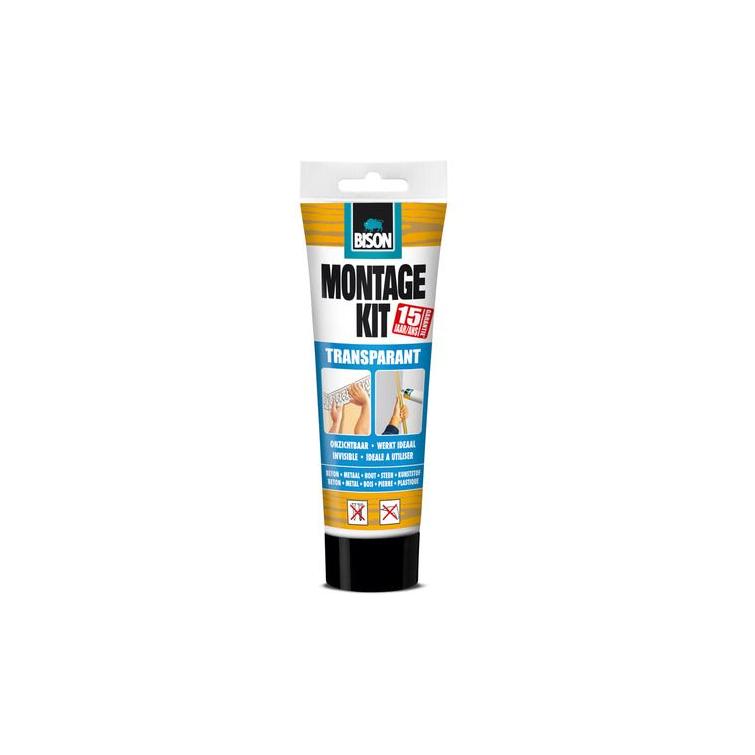 Transparante, sterke, oplosmiddelvrije Bison montagelijm op basis van acrylaatdispersie. Voor het onzichtbaar en muurvast bevestigen van onder andere hout, kunststof, metaal, steen, gips, tegels en piepschuim op poreuze ondergronden zoals beton, steen, pleisterwerk, hout en spaanplaat. Blijvend elastisch en vullend. Deze montagelijm maakt spijkers en schroeven overbodig.