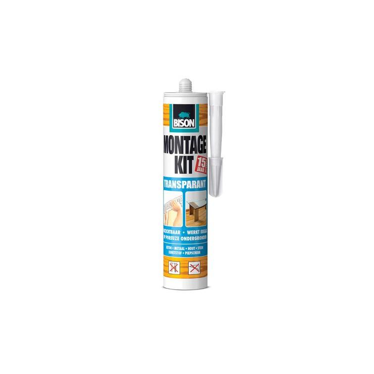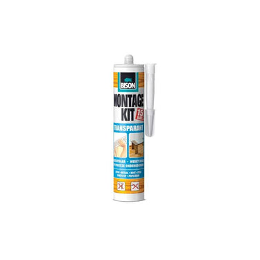Transparante, sterke, oplosmiddelvrije Bison montagelijm op basis van acrylaatdispersie. Voor het onzichtbaar en muurvast bevestigen van onder andere hout, kunststof, metaal, steen, gips, tegels en piepschuim op poreuze ondergronden zoals beton, steen, pleisterwerk, hout en spaanplaat. Blijvend elastisch en vullend. Deze montagelijm maakt spijkers en schroeven overbodig.