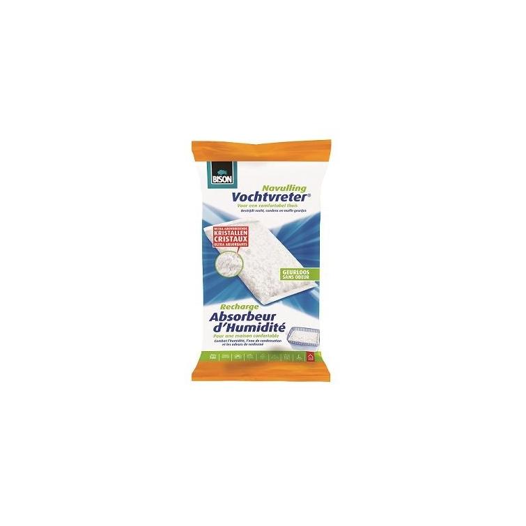 Bison vochtvreter verlaagt met behulp van actieve hygroscopische kristallen een te hoge relatieve luchtvochtigheid in (gesloten) ruimtes met weinig of geen ventilatie en bestrijdt zo condens, vocht en muffe geurtjes. Verbruik: 1 kg werkt circa 3 maanden in een ruimte tot circa 100 m2 en neemt bij een vulling van 1 kilo circa 1 liter water op, afhankelijk van temperatuur, luchtvochtigheid en grootte van de ruimte. Deze navulzak heeft een inhoud van 1 kilo. Geschikt voor onder andere caravan, boot, schuur, meterkast, zolder, voorraadkast, kelder, kruipruimte, logeerkamer, kledingkast, tuinhuis, keukenkast, kluis en wasruimte.