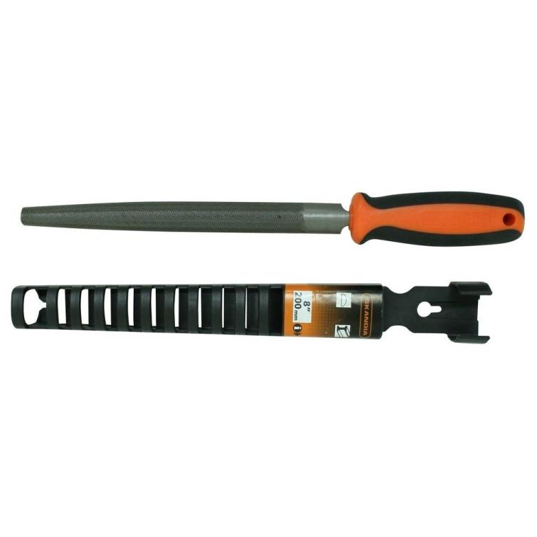 Skandia vijl, halfrond model, taps toelopend. Wordt gebruikt om een werkstuk van hout of metaal middels vijlen een andere vorm te geven of glad te maken. Uitvoering: dubbel gekapt (snijkanten in twee richtingen aangebracht waardoor een groot aantal scherpe tandjes ontstaat) en basterd (grof getand). Geschikt om standaard metaal te vijlen. Twee componenten ergonomisch handvat. LET OP: Pak nooit het metalen gedeelte vast met uw hand. Aangezien dit onbeschermt metaal is zal het zuur van uw hand het metaal doen laten roesten! Wordt daarom inclusief gratis beschermende houder geleverd. Lengte zonder handvat 200 mm.