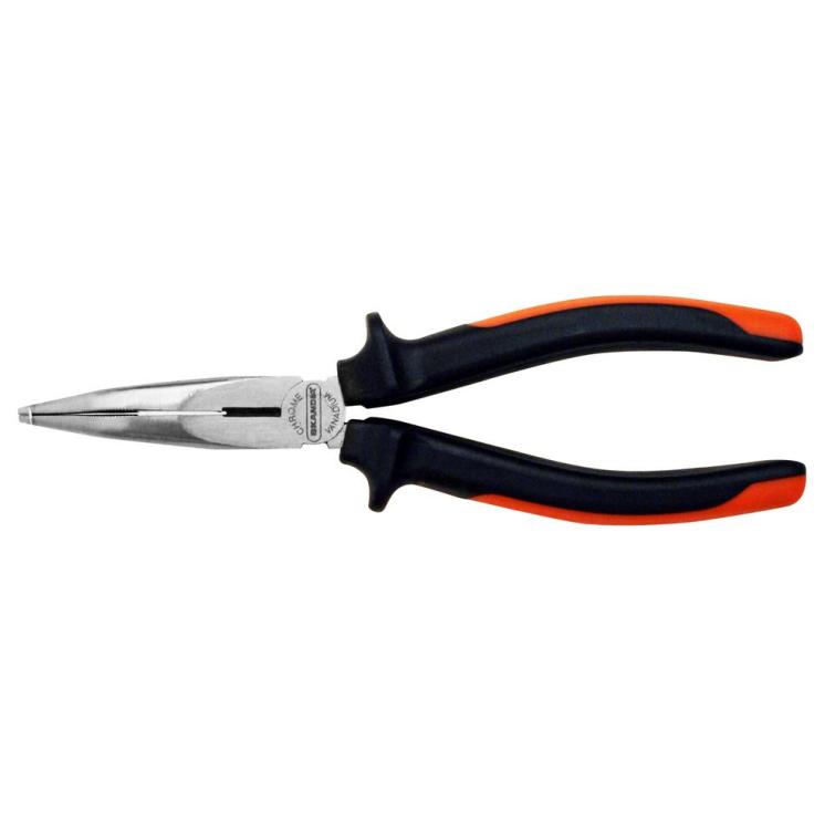 De Skandia telefoontang, ook wel punttang of radiotang genoemd. Het betreft hier het gebogen model. Een telefoontang sluit niet over de totale lengte van de bekken, waardoor bij het dichtknijpen van deze tang de grootste druk aan de punten van de bekken ontstaat. De halfronde bekken hebben aan de binnenzijde een karteling voor een goede grip op het materiaal. De bekken zijn voorzien van een zijknipper om zacht metaaldraad mee te knippen. Vervaardigd uit hoogwaardig chroom-vanadium staal, blank gepolijst. Zwart/oranje, 2-componenten kunststof handgrepen met anti-slip en beschermnokken.