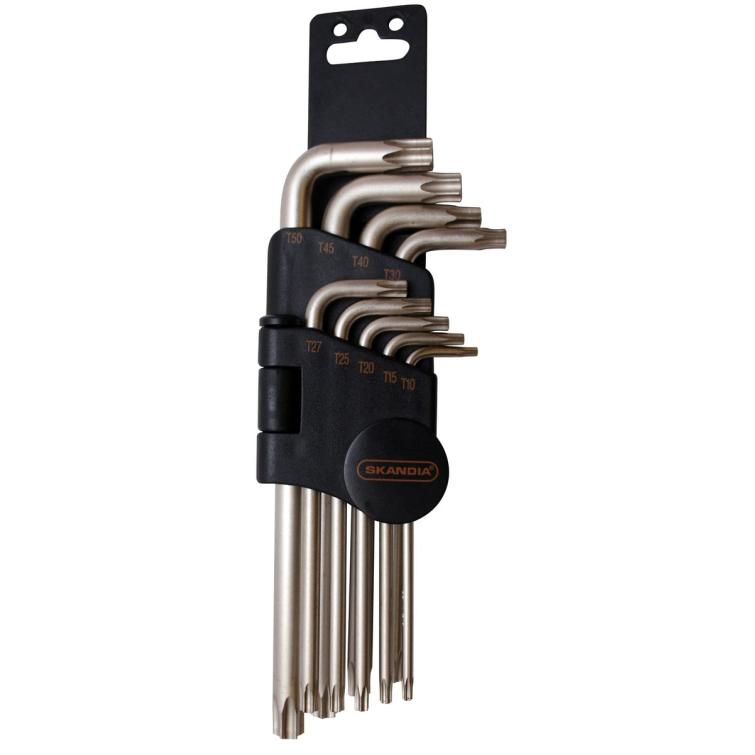 Skandia Torx-inbussleutelset, ook wel Torx-stiftsleutelset genoemd, 9-delig in een kunststof houder met broekclip. Een torxkop op een schroef bestaat uit een stervormig gat met zes hoekpunten waarin de torxsleutel past. Deze 9-delige set is een zogeheten Tamper Resistant torx(afgekort Torx TR) en heeft ook nog een gaatje in het midden. Torx TR schroeven kunnen niet met een standaard torxsleutel worden losgedraaid. Torx heeft als voordeel een betere overbrenging van de kracht van de schroevendraaier op de schroef en minder kans dat de sleutel uit de schroef schiet. Hierdoor wordt de montage makkelijker. Dit lange model bestaat uit de maten: Torx TR 10, 15, 20, 25, 27, 30, 40, 45, 50. Vervaardigd uit chroom vanadium staal, vernikkelde uitvoering.